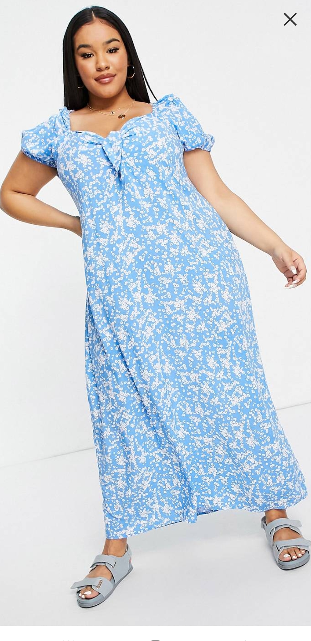 Next up is this blue floral print midi dress. It has a gorgeous neckline perfect for someone with a fuller bust.