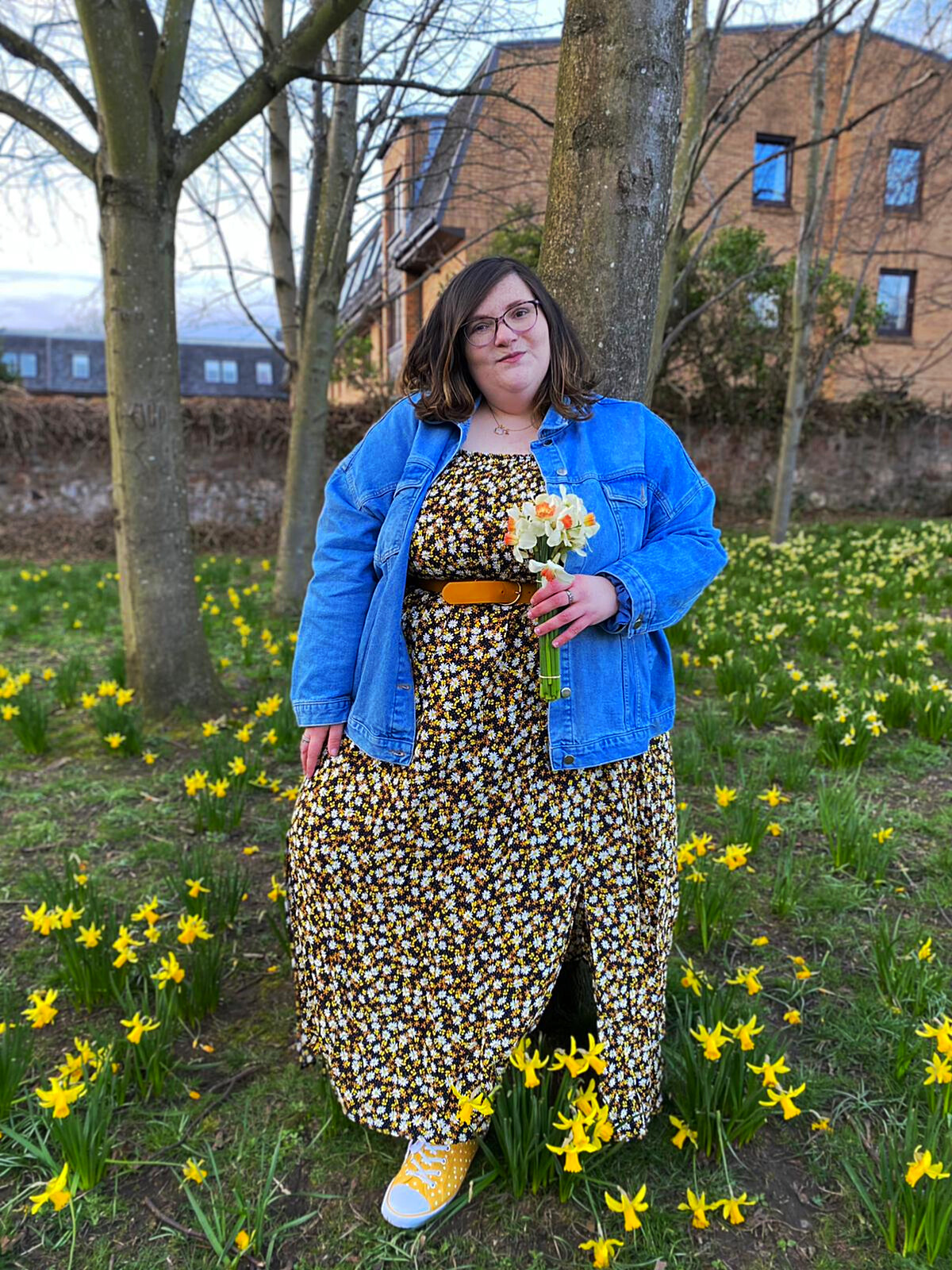 Next up is a Black & Yellow Ditsy Floral Shirred Bardot Maxi Dress. I love the print and colours of this and is super comfy and flattering too. I styled with a denim jacket and belt too for a spring picnic look.
