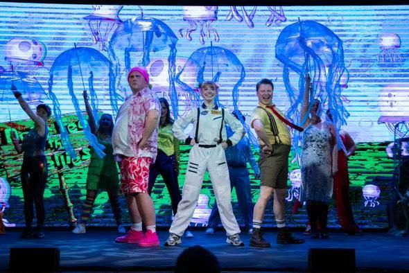 As audiences step into the Church Hill theatre, they are instantly immersed in the enchanting world of Bikini Bottom. The auditorium is adorned with thematic decorations, while dynamic lighting and engaging graphics grace the on-stage screen, setting an inviting atmosphere even before the curtain rises. The production creatively integrates this screen element, using animations to provide a captivating backdrop that enhances the storytelling, freeing up physical space for a large ensemble cast to showcase their talents. This innovative use of technology allows for imaginative choreography and staging, making the performance all the more captivating.