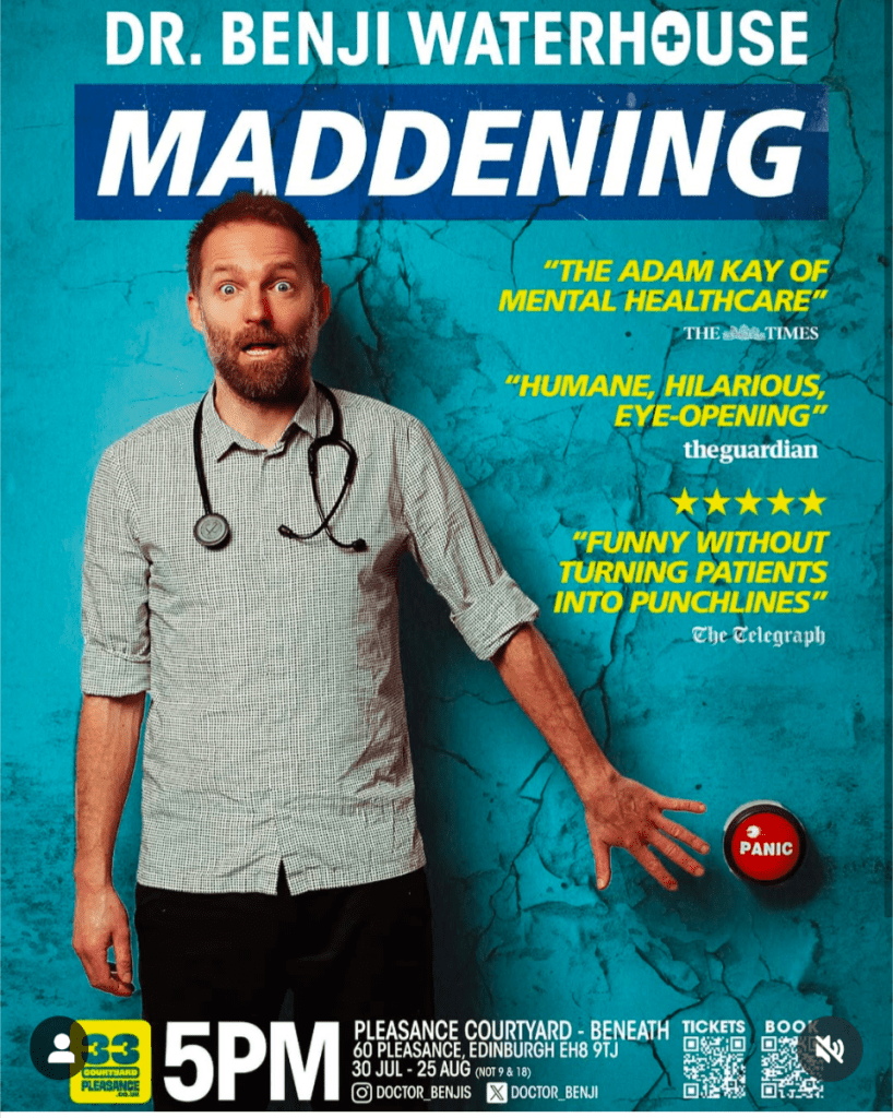 Psychiatrist, comedian, and best-selling author Dr Benji Waterhouse brings his unique blend of stand-up and storytelling to the Edinburgh Fringe with Maddening—a deeply personal, darkly funny, and beautifully written show that explores the realities of working in the NHS mental health system.